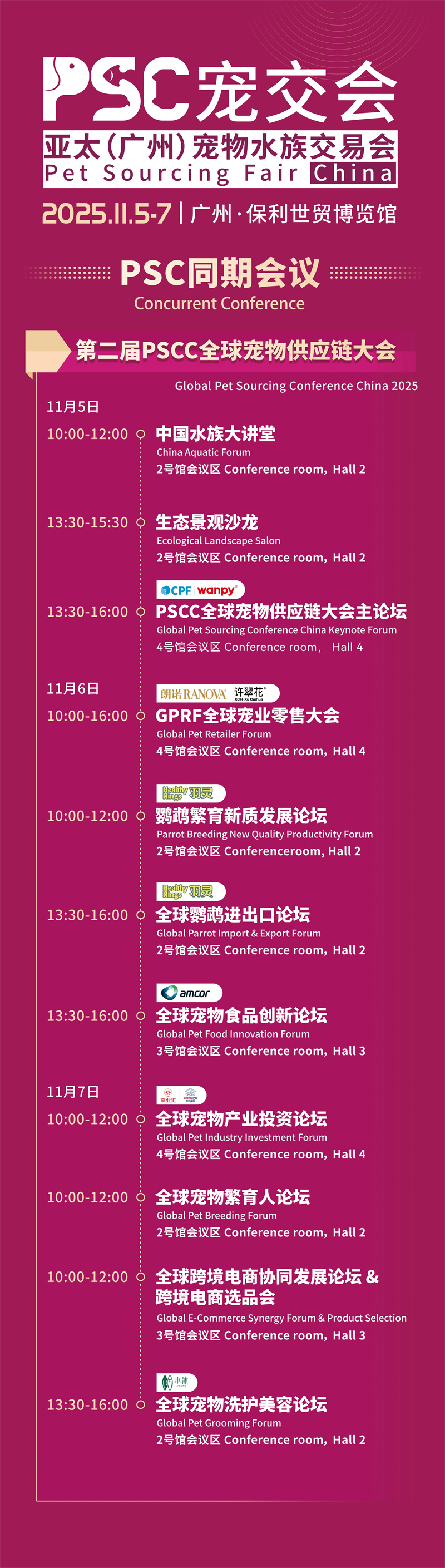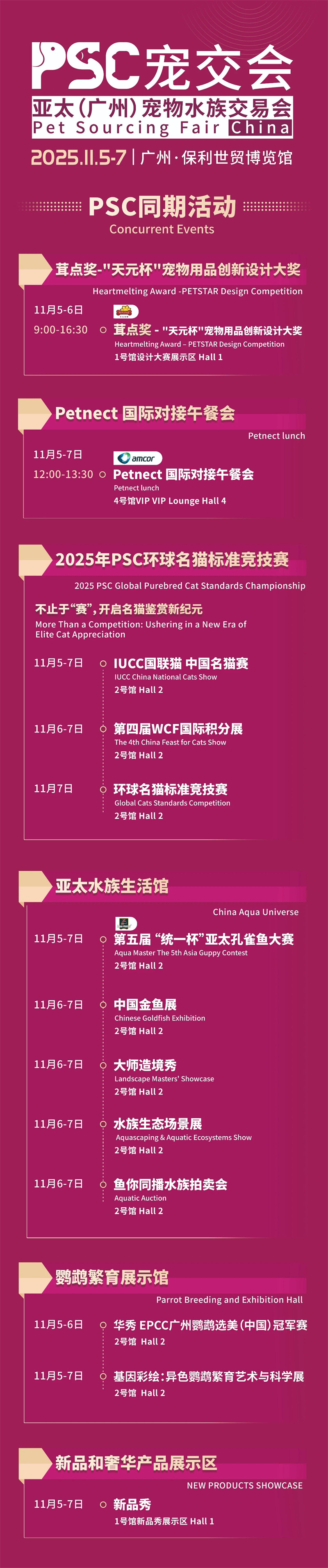 Competições em destaque:A 2025 PSC Global Cat Standard Competition será realizada de 5 a 7 de novembro no Hall 2, incluindo o IUCC National Cat Show (5 a 7 de novembro), o 4º WCF International Points Show (6 a 7 de novembro) e a Global Cat Standard Competition (7 de novembro), inaugurando uma nova era de apreciação de gatos com pedigree; Exposições temáticas: O Pavilhão de Estilo de Vida do Aquário da Ásia-Pacífico será apresentado no Hall 2 de 5 a 7 de novembro, cobrindo a 5ª Competição de Guppy da Ásia-Pacífico "Copa Unificada", a Exposição de Peixe Dourado da China, o Master Creation Show e a Exposição de Cena Ecológica do Aquário. O leilão do aquário "Fish and You Broadcast Together" será realizado simultaneamente nos dias 6 e 7 de novembro; O Parrot Breeding Exhibition Hall sediará o Campeonato Huaxiu EPCC Guangzhou Parrot Beauty Pageant (China) no Hall 2 de 5 a 6 de novembro, e a "Exposição de Pintura Genética: Arte e Ciência da Criação de Papagaios de Cores Diferentes" será realizada de 5 a 7 de novembro, cobrindo subáreas como aquários e papagaios.